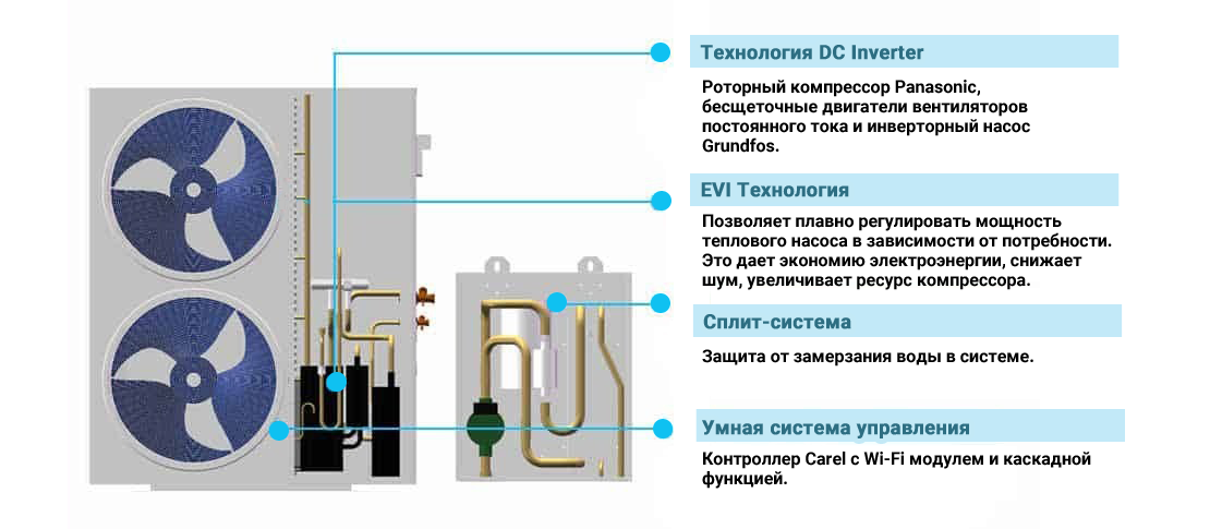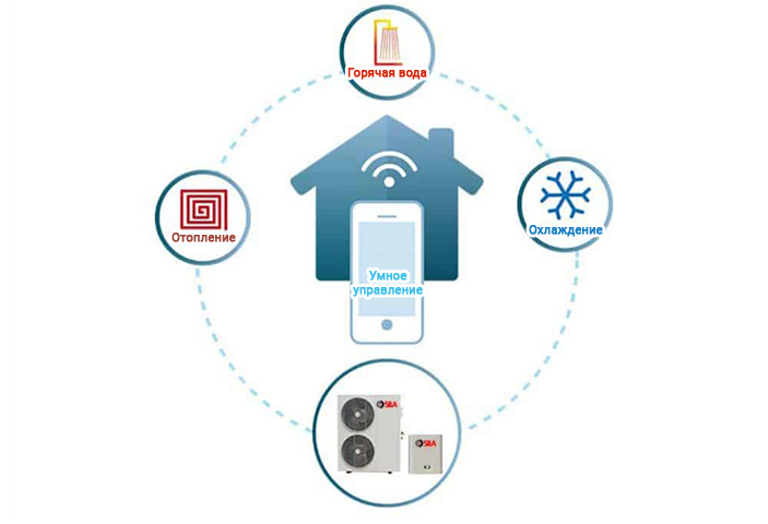 - 5 режимов работы: отопление, горячее водоснабжение, охлаждение, отопление + ГВС, охлаждение + ГВС;